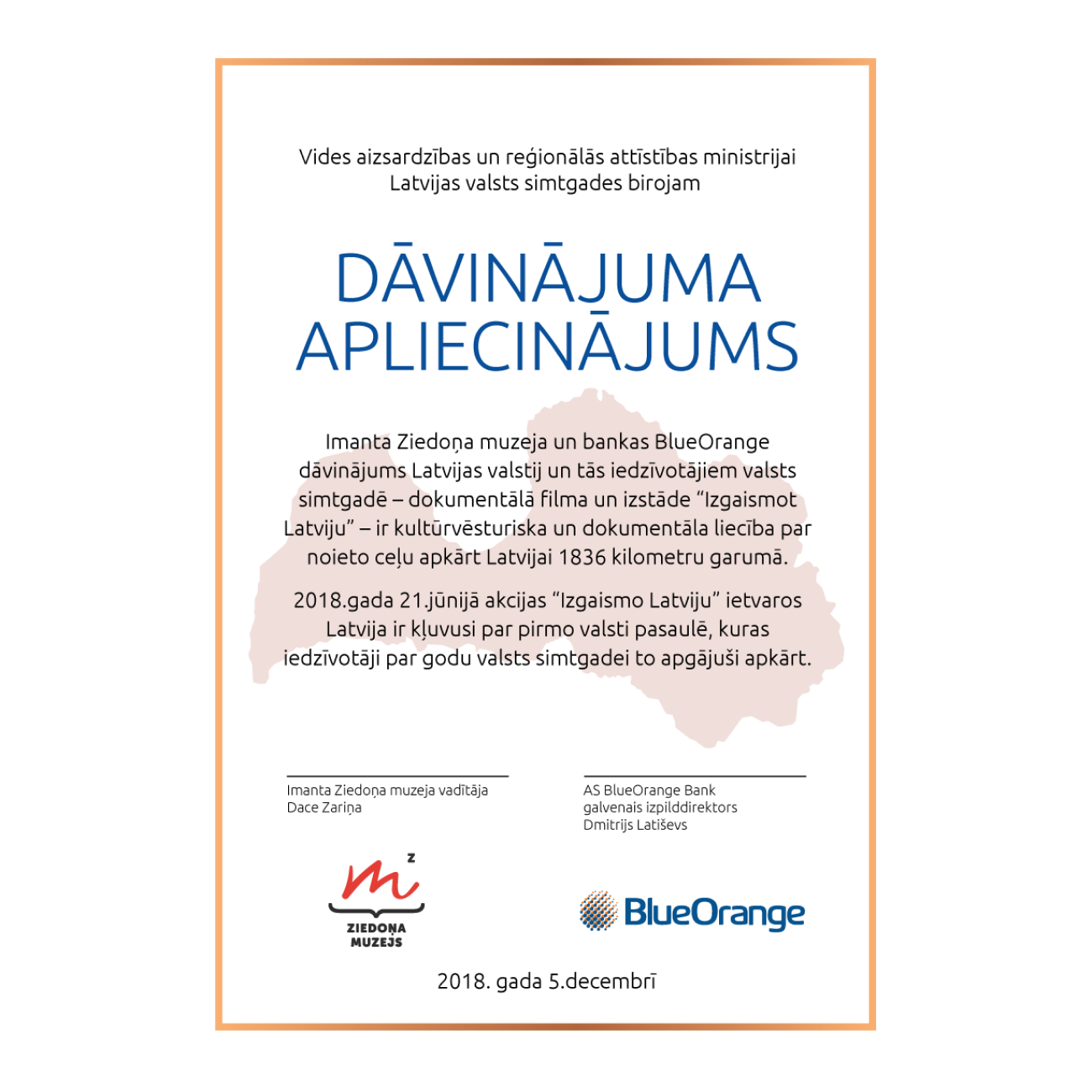 The film and the exhibition “Izgaismot Latviju” are a gift to Latvia on its centenary from the Imants Ziedonis Museum and BlueOrange Bank. Before the premiere of the film, the gift was symbolically received on behalf of the Ministry of Environmental Protection and Regional Development of the Republic of Latvia (VARAM) by its Parliamentary Secretary Jānis Eglītis.