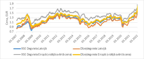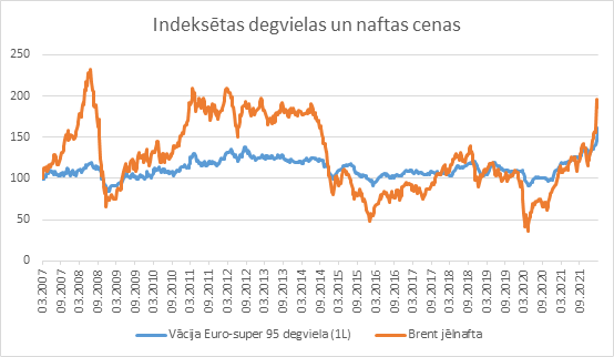 Latvia’s retail fuel prices are around 0.10 euro cheaper per liter than French fuel prices due to lower taxes. Therefore we could theoretically expect a maximum pain level of up to 2.70 euro per liter of Euro 95 gasoline before politicians around Europe give in to popular outcry and lower taxes to offset higher crude oil prices.