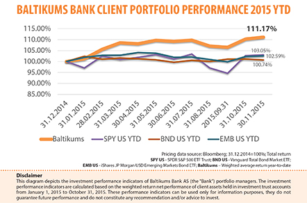 Thankfully, here at Baltikums Bank, our client portfolio management team has managed to generate exceptional returns that once again reflect the merits of our independent, decisive and goal-orientated asset management philosophy. Moreover, our investment performance this year is also a credit to our private bankers and - most importantly - our clients’ commitment to long-term, strategic thinking. This support has allowed us the freedom to purchase underpriced assets at attractive valuations and reap their rewards in the future.