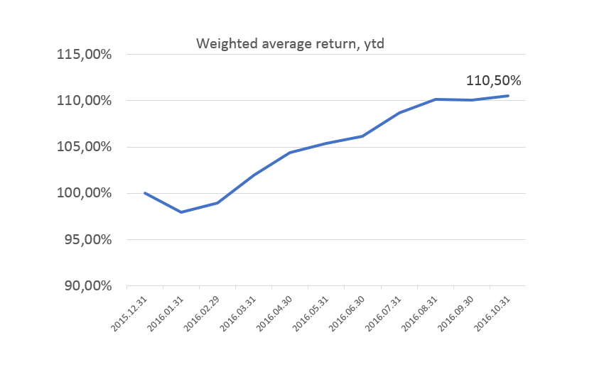 October was spent in the shadow of US presidential elections. Stock markets were flat or slightly negative, and we are seeing increased performance disparity between individual sectors. Despite these headwinds of uncertainty, we managed to earn 0.43% for our clients, bringing our year-to-date weighted average gain to 10.5% after fees.