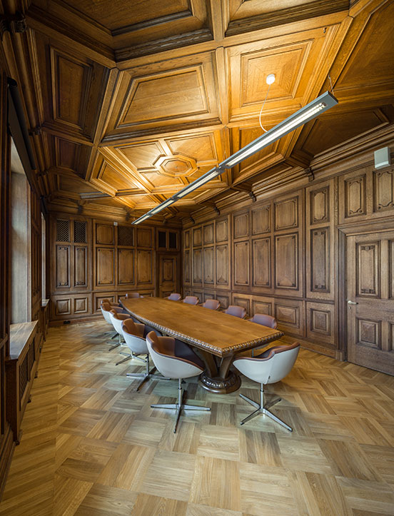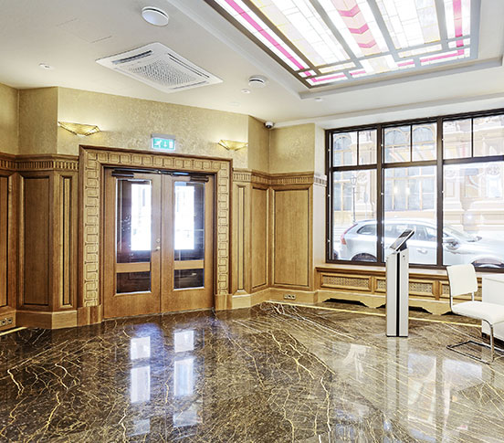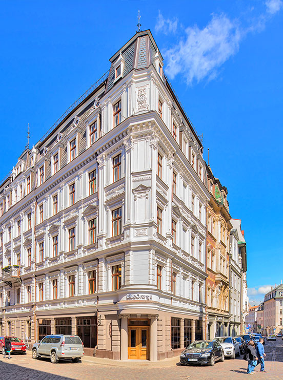The building’s magnificent façade has been fully restored and painted in its original colour, a pale cerulean hue that makes the decorative elements stand out more. The first ever reinforcement of the building’s foundation has been carried out, which is of particular importance in the historical centre of Old Riga. Construction works have also been accompanied by archaeological supervision, improving our knowledge about the history of this grand structure. Restoration of windows and doors as well as reconstruction of the entire utility system have been carried out with particular care; an elevator has been installed in the interior yard of the building, providing access to all storeys.