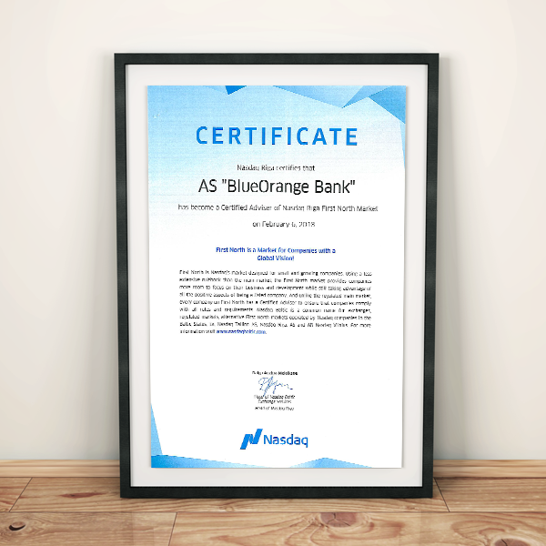 As of 6 February 2018, BlueOrange Bank is granted the status of a Certified Adviser on the First North market in Latvia by Nasdaq Riga.