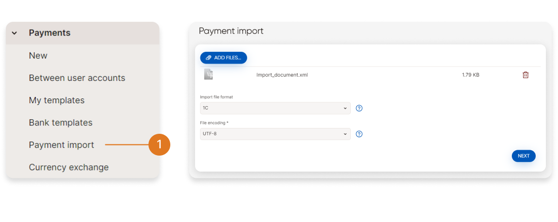 In the internet banking system, you can import files in the following formats: *.csv; FiDAViSta, 1C, ISO 20022.