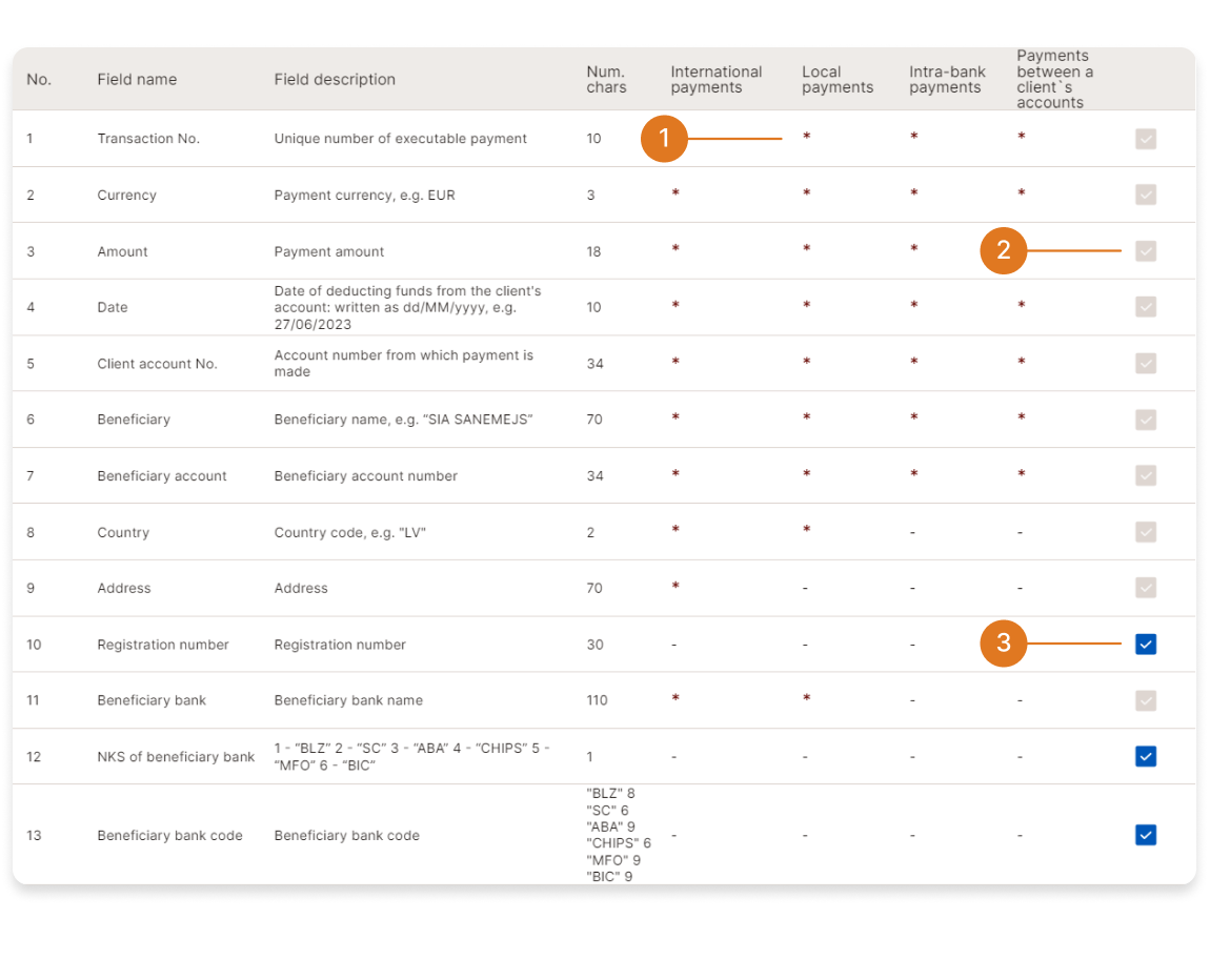 - If a specific field is optional for the payment type (there is no asterisk next to the field in the respective column), but the last column is marked with a gray checkmark that cannot be removed, then the specified field should be present in the imported file, but the field value can be empty.