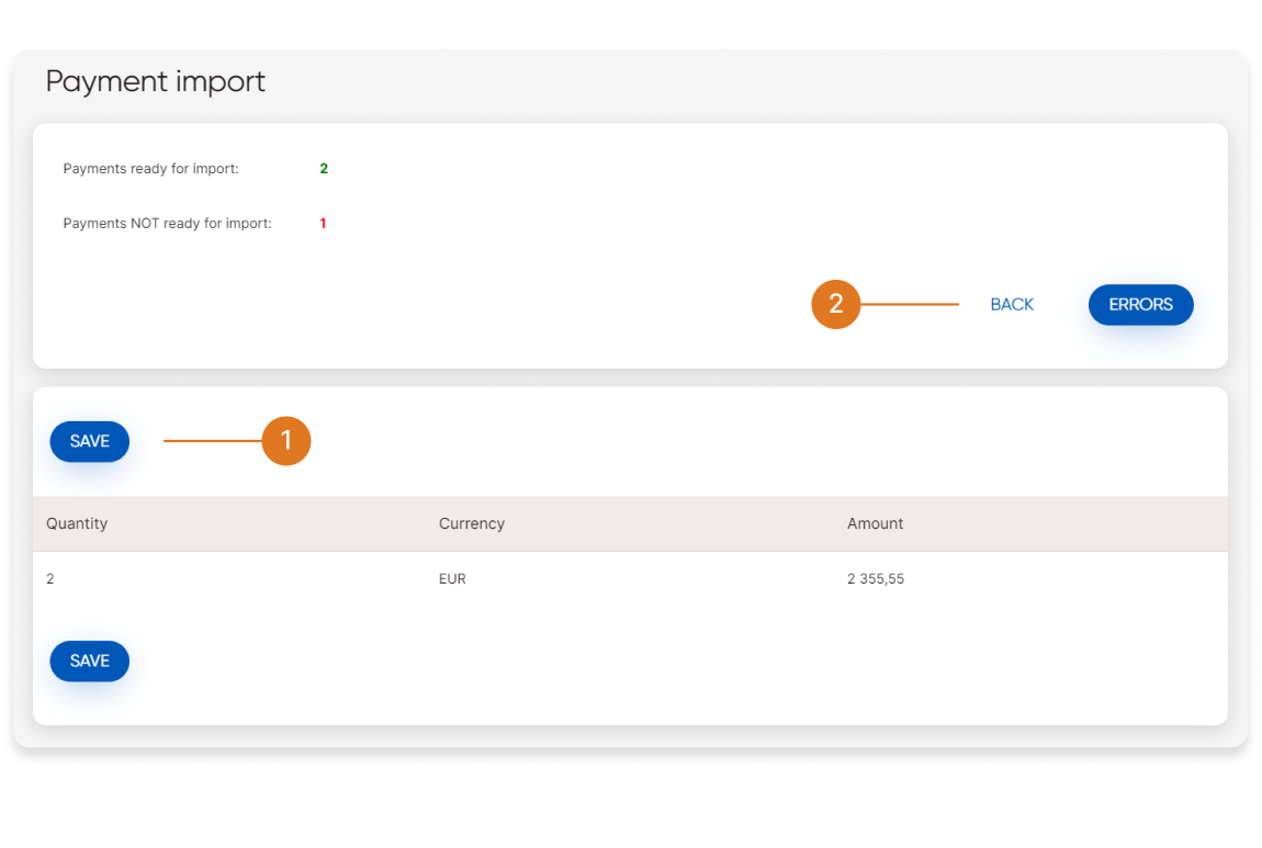 - You can perform a partial import of the file by clicking the "Save" button. Successfully processed payments will be imported into the internet banking system, and you can view them with the status "New" in the "Customer Transactions/For Signature" menu.