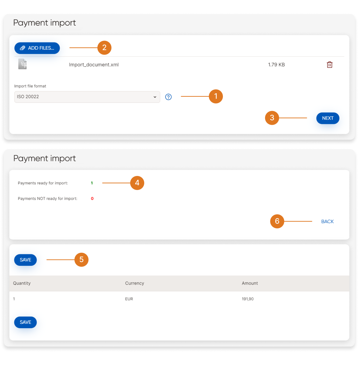 - In the payment import screen, select "ISO 20022" as the "Import File Format" value.