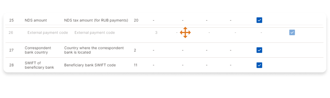 To indicate the position number of each payment instruction field in the import file row, click on the field and move it using the mouse to the desired position.
