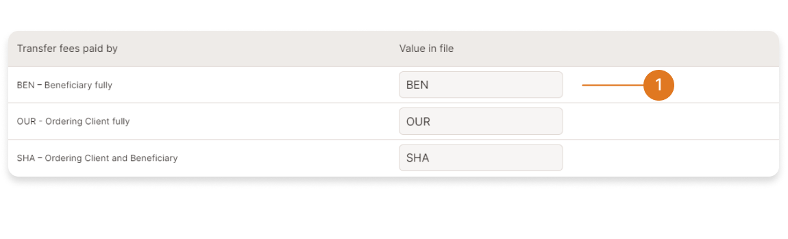 The format of the imported payment file for a single payment instruction (one row according to the parameters specified in the file field table).