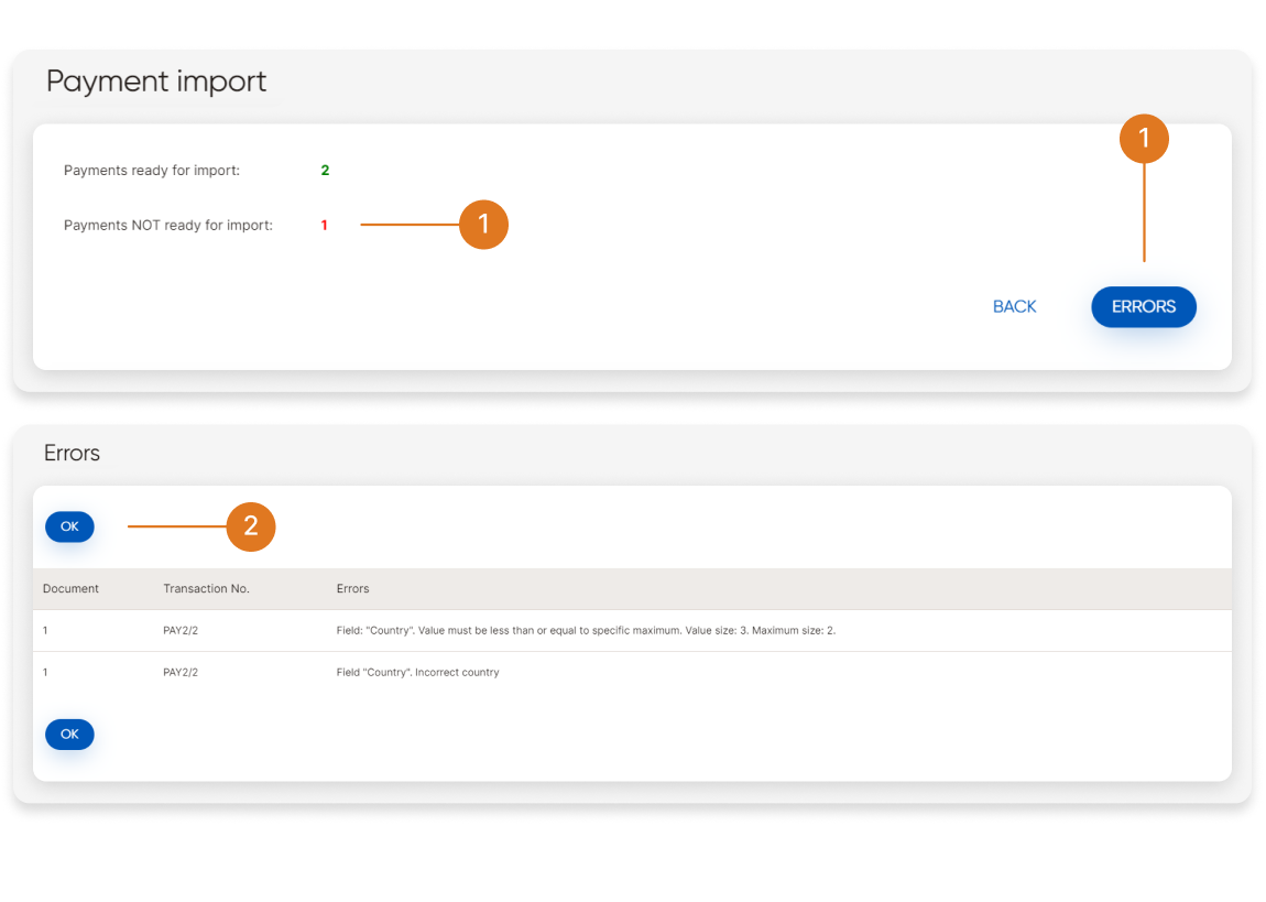 - If a payment cannot be imported, by clicking on the "Errors" button, you can view a list of errors detected in the payment.