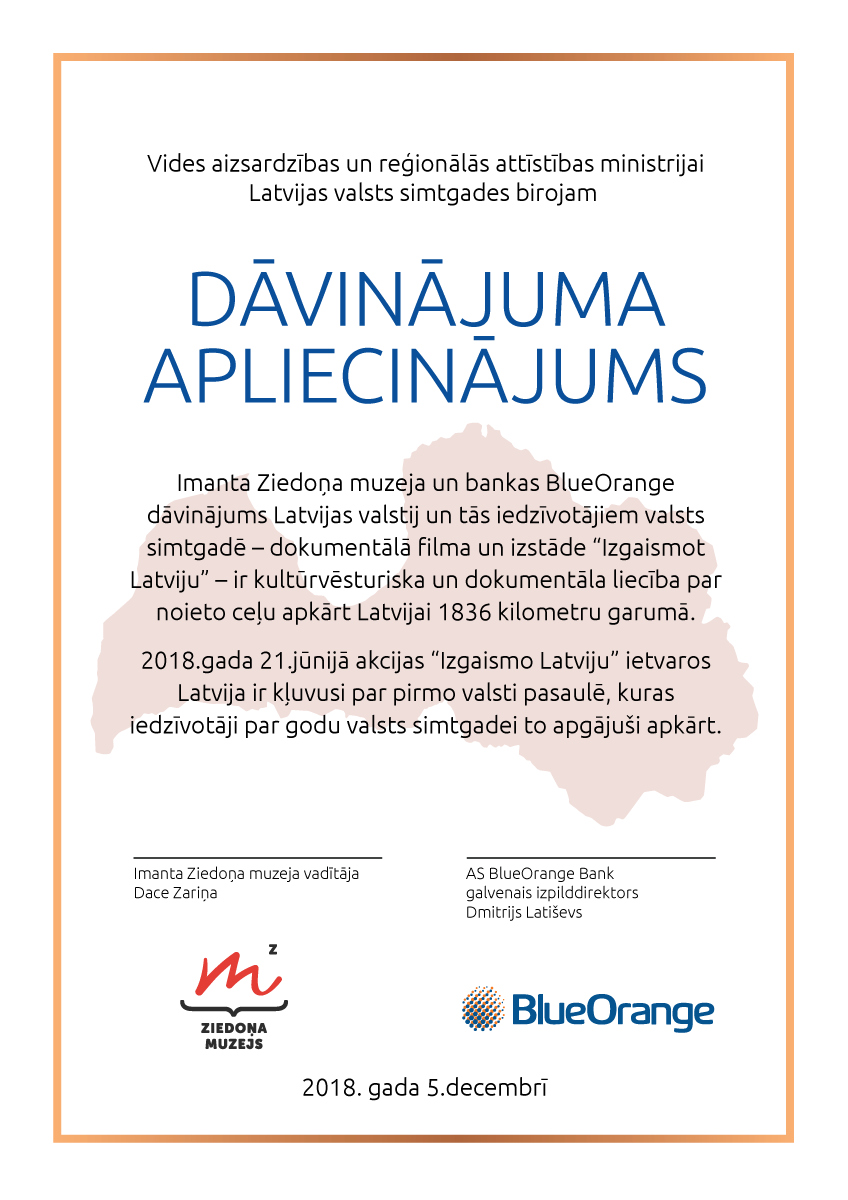 The film and the exhibition “Izgaismot Latviju” is a gift from Imants Ziedonis museum and BlueOrange Bank to Latvia in its hundredth anniversary, and was presented to the Ministry of Environmental Protection and Regional Development of Latvia on 5 December 2018 by Dmitrijs Latisevs, Chief Executive of BlueOrange Bank.