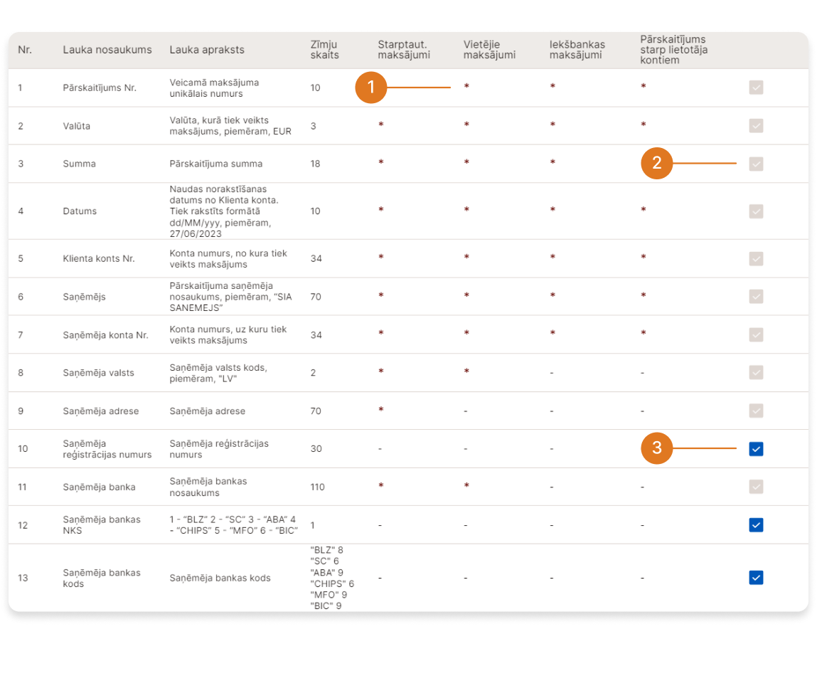 ➁ - Ja noteiktam maksājuma veidam konkrēts lauks ir neobligāts importam (blakus laukam attiecīgajā kolonnā nav zvaigznītes), bet pēdējā kolonnā ir "ceļzīme" pelēkā krāsā, kuru nevar noņemt, tas nozīmē, ka importējamajā failā jābūt norādītam šim laukam, bet vērtība laukā var būt tukša.