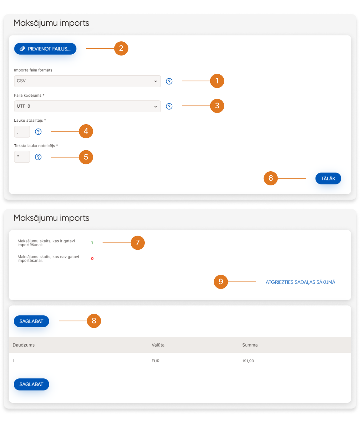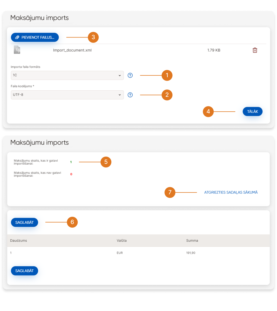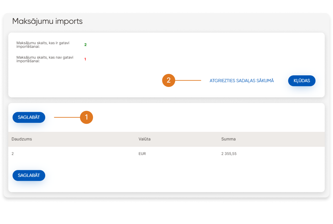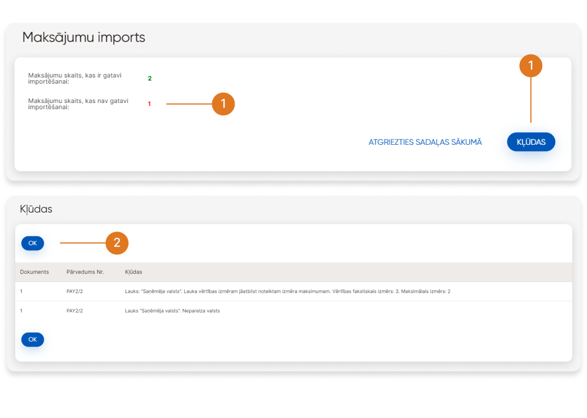 ➆ - Tiks atvērts ekrāns, kurā tiks parādīts veiksmīgi un neveiksmīgi apstrādāto maksājumu skaits importam.