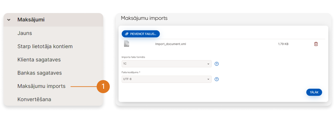 ➀ - Lai pārietu uz importēšanu, atveriet sadaļu "Maksājumi" sānjoslā un pārietiet uz "Maksājumu importēšanu".