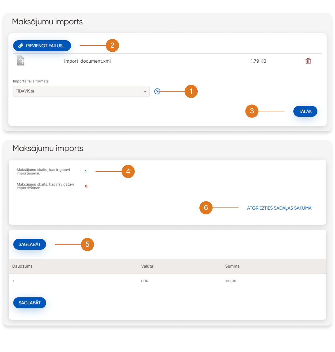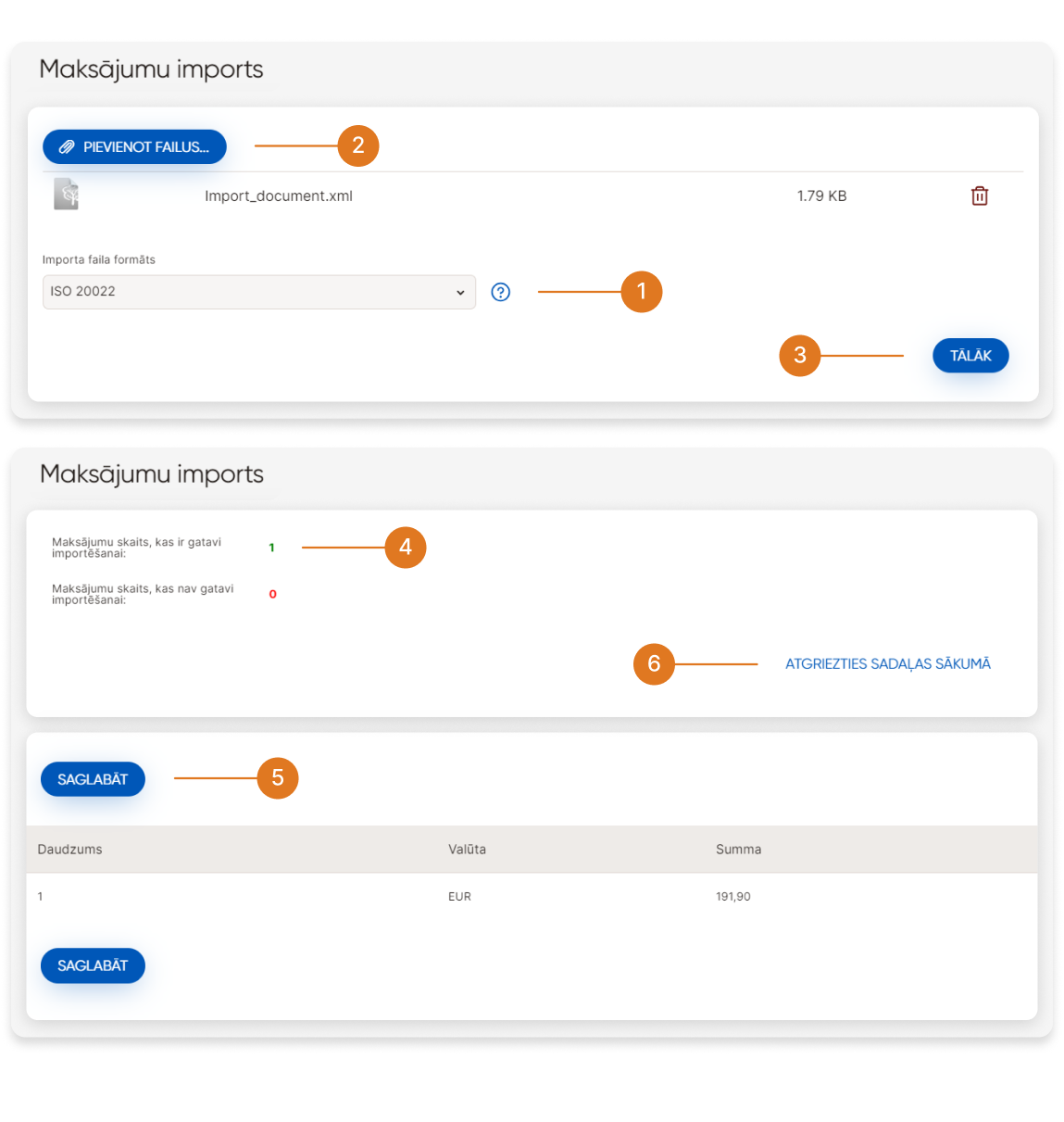➄ - Tiks atvērts ekrāns, kurā tiks parādīts veiksmīgi un neveiksmīgi apstrādāto maksājumu skaits importam.