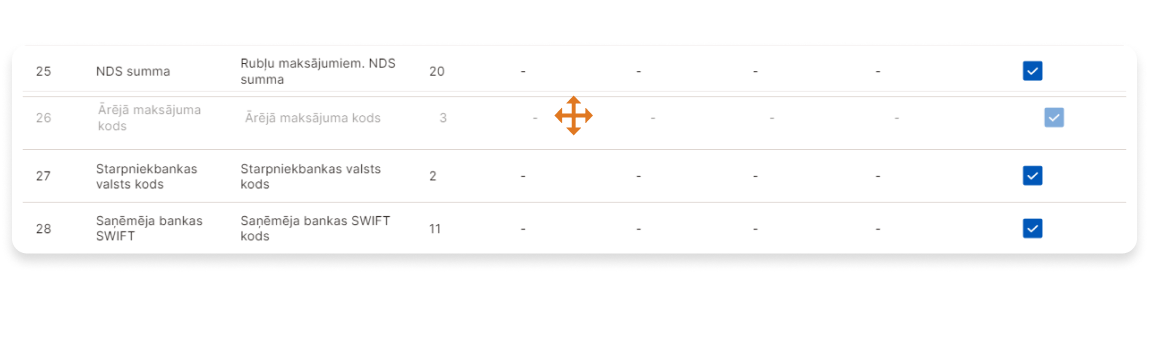 Norādiet lauku pozīcijas numuru maksājuma rīkojuma faila rindā, nospiežot attiecīgo lauku un pārvietojot to ar peles palīdzību uz vietu, kur vēlaties ievietot šo lauku.