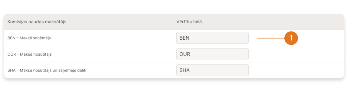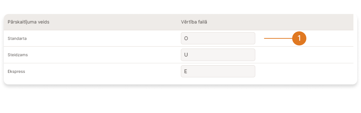 ➀ - Sadaļā "Pārskaitījuma veids" ir norādīta pārskaitījuma steidzamība, ko var mainīt attiecīgajos laukos "Vērtība failā", ja importēšanas failā steidzamības vērtības atšķiras no noklusētajām vērtībām: Parasts - "O"; Steidzams - "U"; Ekspresis - "E".