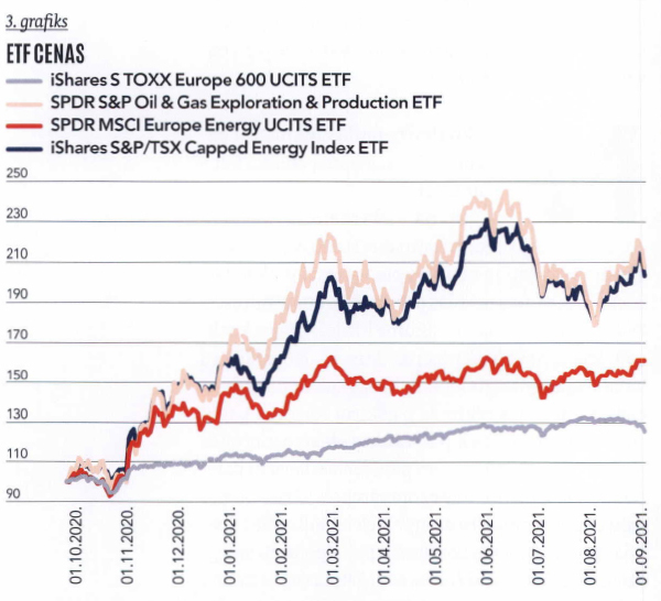 Индекс EuroStoxx 600 с 1 октября 2020 возрос на 31% (по данным 17 сентября), а MSCI Europe Energy Sector Index показал общую доходность в 58% – почти вдвое выше EuroStoxx 600. За этот период стоимость сырой нефти Brent увеличилась на 84%, а стоимость природного газа – на 102%. При этом нефтегазовый сектор в Северной Америке обеспечил общую доходность в 120% (US Oil and Gas Producers ETF: доходность в эквиваленте евро +119%; Canadian S&P/TSX Capped Energy Index ETF: доходность в эквиваленте евро +122%).